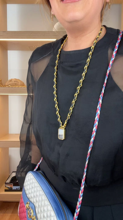 Details: Metallic blue, silver and red quilted leather throughout. Mixed metals hardware. Zip top closure. Floral interior lining. Made in Italy.