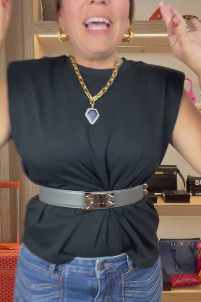 Details: Size 75. 5 notches to tighten. Palladium hardware. Grey leather. Brown interior.