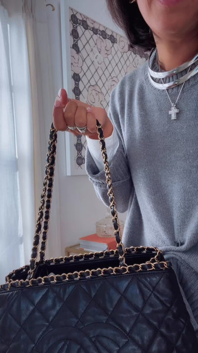 Details: Black leather quilted exterior with large CC logo. Base protective feet on bottom corners. Chain link detail at opening and shoulder straps. Magnetic snap closure. Interior lined in black fabric with two compartments. Made in Italy.