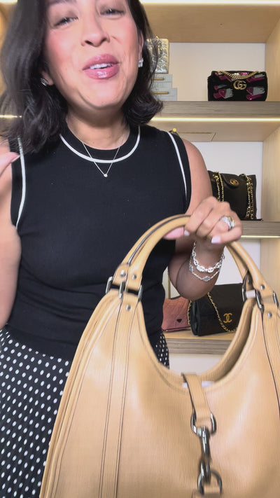 Details: Camel pebbled leather exterior with silver tone hardware. Lobster claw closure. Top handles. Interior lined in brown fabric with one open pocket. Made in Italy.
