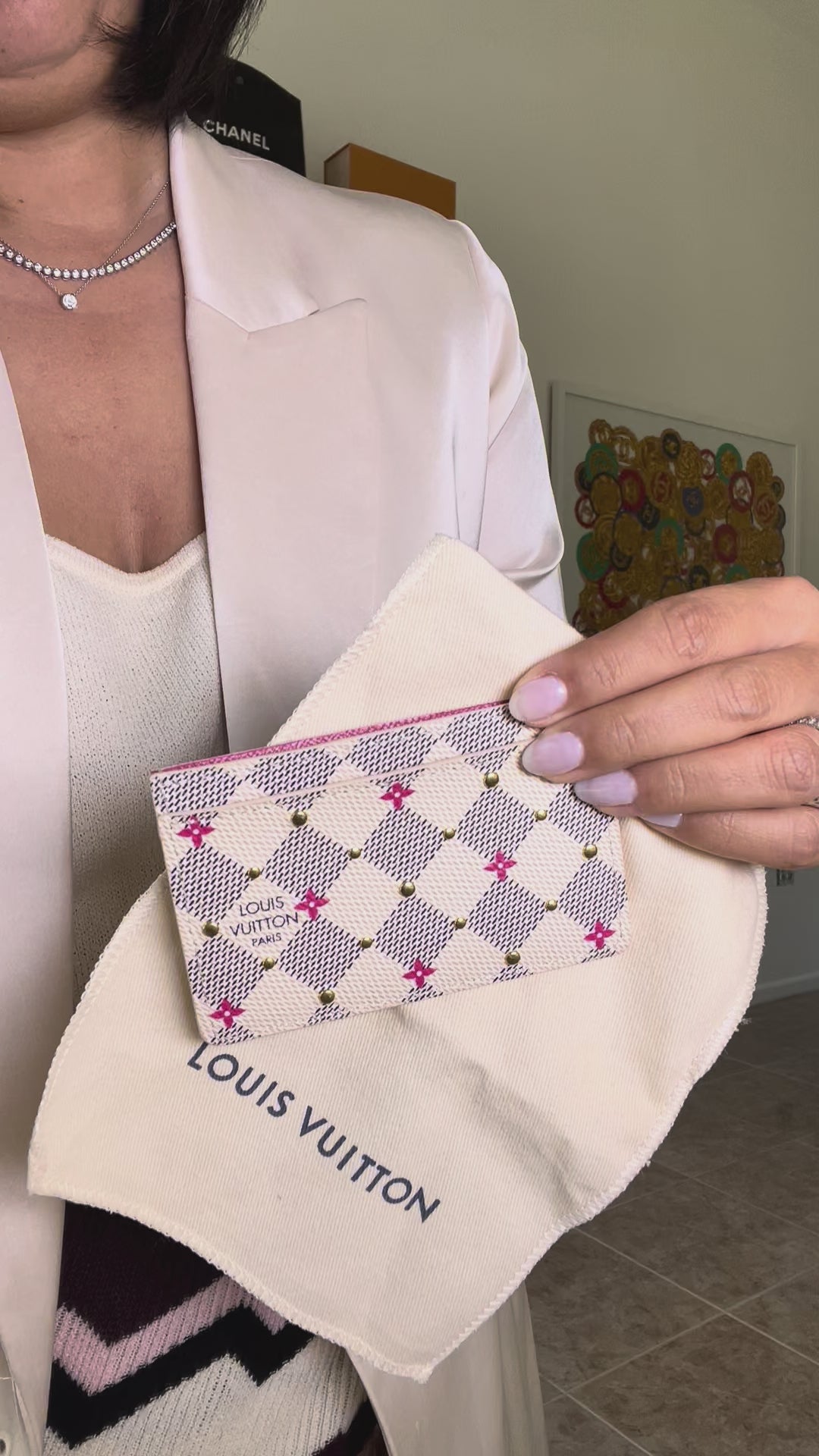 Details: Limited Edition Damier Azur Studded Card Holder. Damier Azur coated canvas. Accented with gold tone studss throughout. Pink Rose Ballerine interior lining.